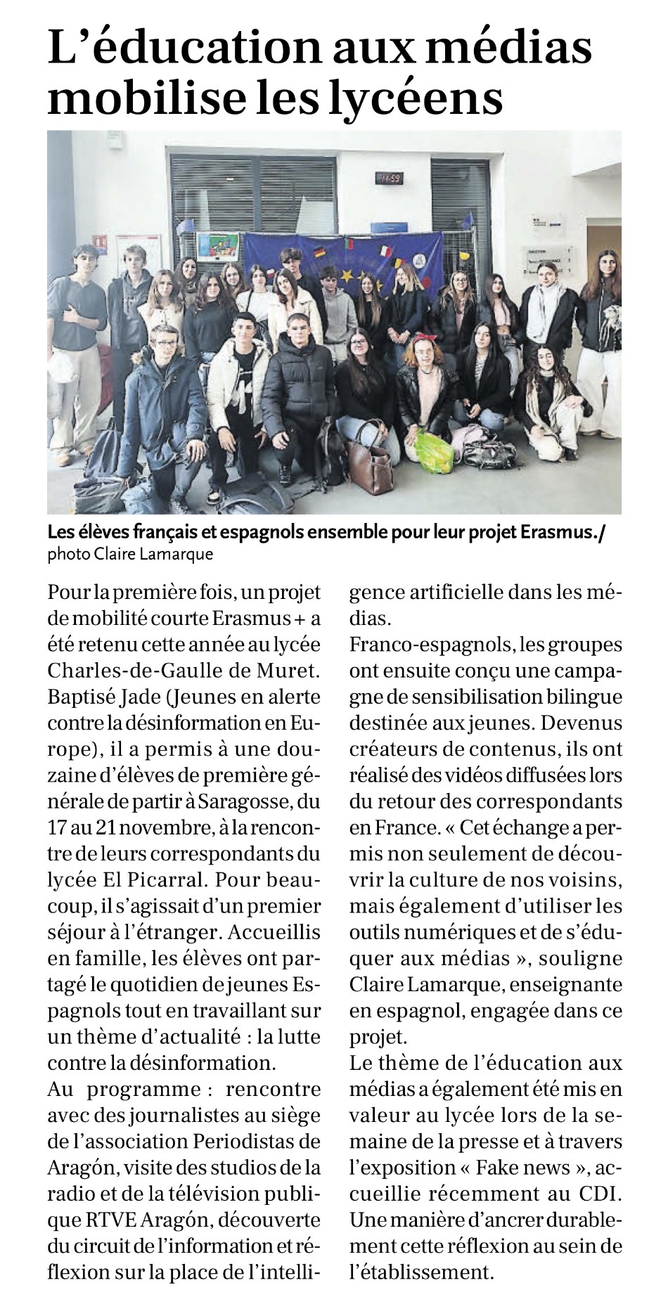 A l'occasion de la "Semaine contre les Fake News" organisée au lycée, les élèves de 1ère Générale ont présenté leur campagne de sensibilisation contre la désinformation dans le cadre de leur projet courte mobilité ERASMUS+ .