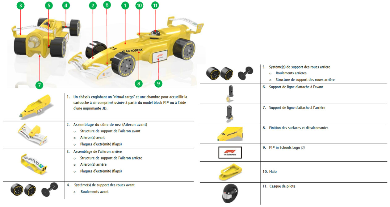 L'assemblage d'une voiture STEM Racing ne doit comporter que les éléments suivants :